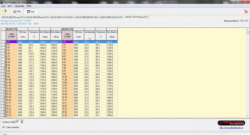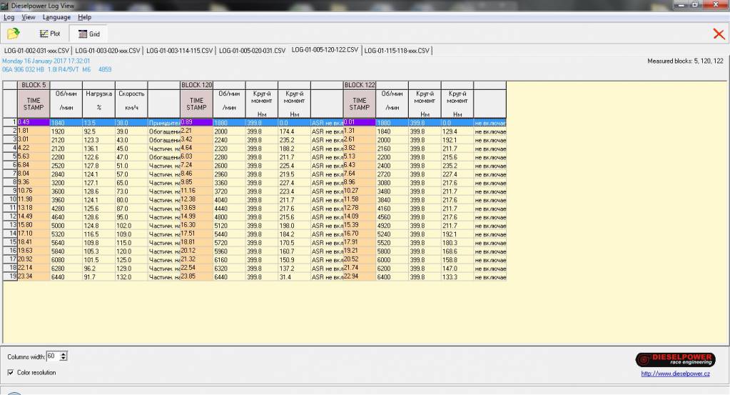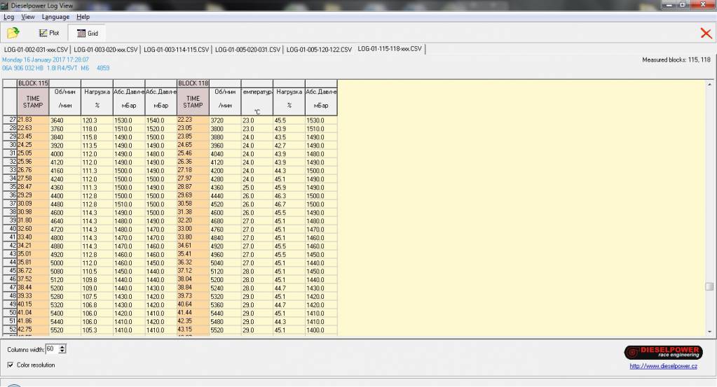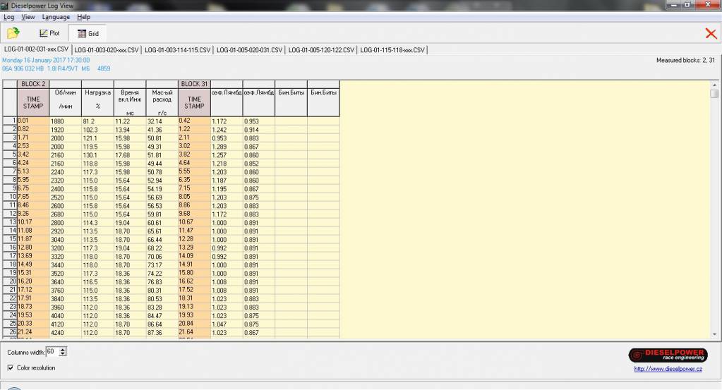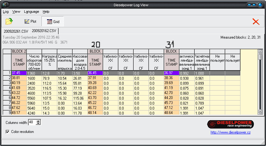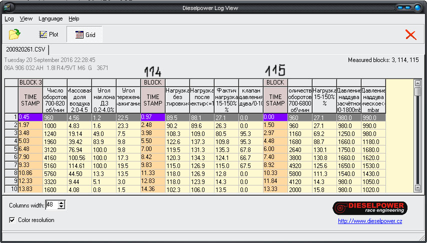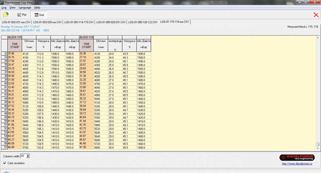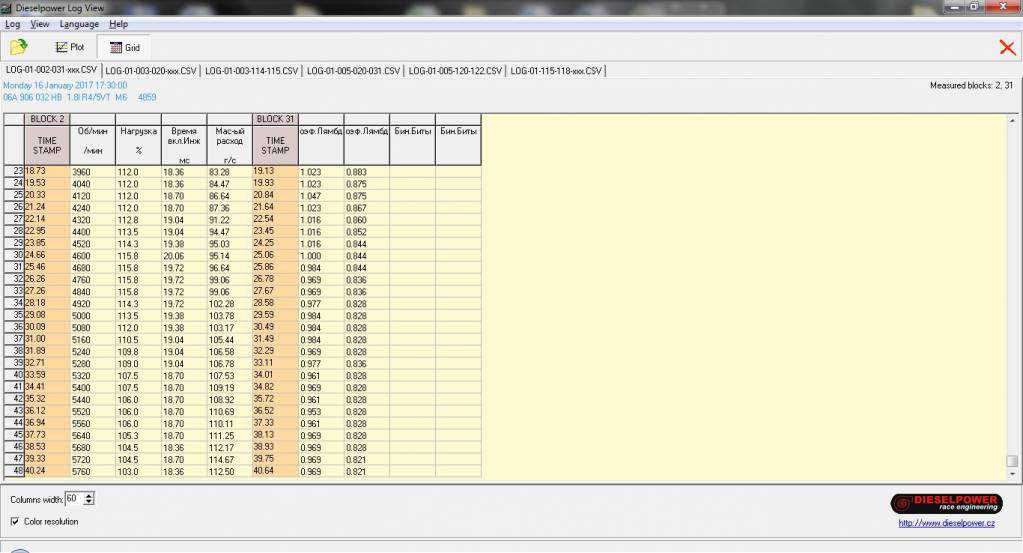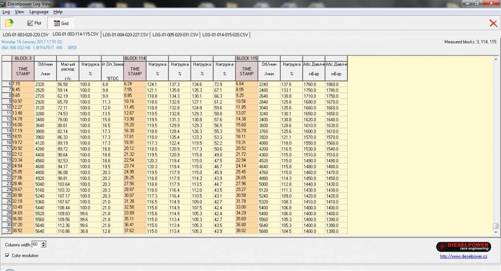 Значит так. Турбина у тебя дует так, как это описано в букваре. Значит сама турбина и датчик давления наддува, а так же впускной тракт за турбиной в полной исправности. Показания ДМРВ. Занижает массовый расход воздуха. В пике около 5000 оборотов он должен выдавать 120 грамм. Твой показывает 103. Делим на 0.8, получаем 128 л/с. Расчет грубый, но не лишенный смысла. Причиной может быть подуставший ДМРВ, или дырки во впуске до турбины. В работе клапана n75, я проблемм то же не вижу. Все в норме. Ещё одна видимая проблема - это слишком богатая смесь. Слишком богатую смесь показывает лямбда, но и не многим меньше просит ЭБУ. Думаю, что этот глюк из за газового оборудования. Газ беднит смесь, ЭБУ добавляет. Мозг к этому адаптируется. В последствии при работе на бензине, по газовым настройкам смесь получается переобогащенной. Подтверждение моей теории будет видна в 32 группе. Её показаний я тут не вижу. Итог, что бы я тебе посоветовал, с помощью газовщиков чуть обогатить смесь на газу. Отключить гбо, подключить ваг ком и провести сброс ошибок, даже если их там нет. После этой процедуры в 32-й группе в обоих окошках будет 0. Не включая ГБО, снять логи, групп: 003,114,115 и 003, 020, 031. Два лога. Записать показания в группы 032, после снятия лога. Я думаю, что в процессе ты сам почувствуешь, что машина станет заметно динамичнее. Получившиеся показания, сюда. Ещё раз посмотрим. Обращаются внимание, что при снятии логов мотор должен быть прогрет до рабочей Температуры, тапку жать резко и сразу в пол, не ослабляя нажатия во весь процесс ни на грамм.