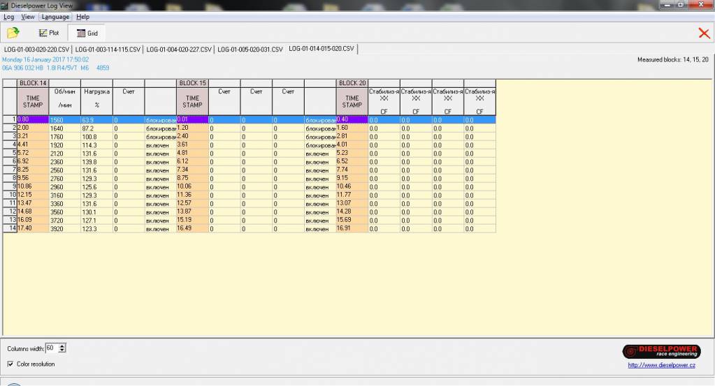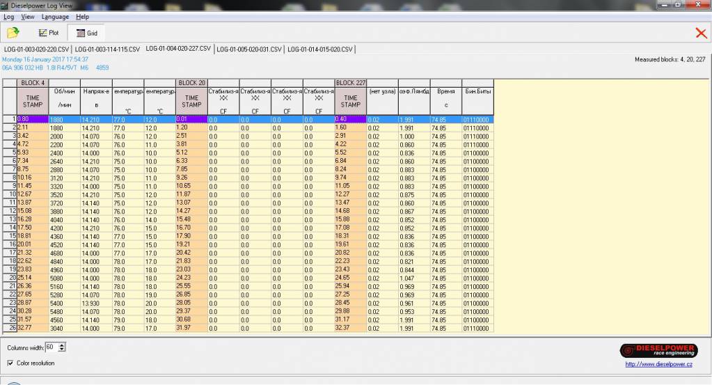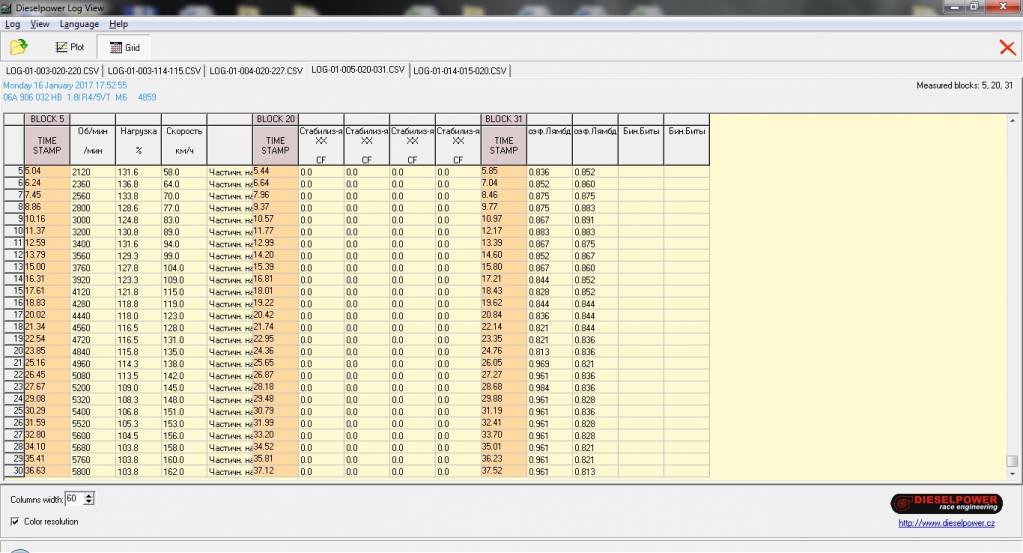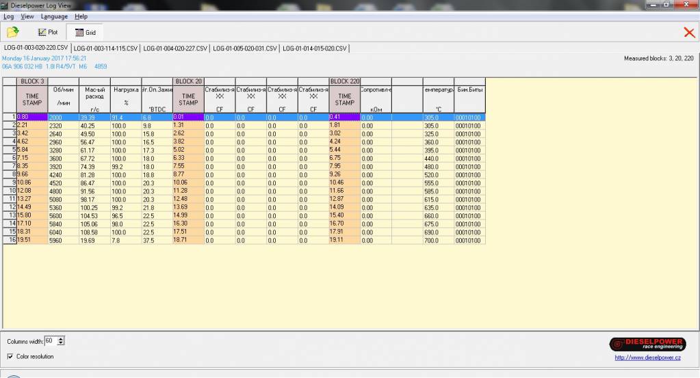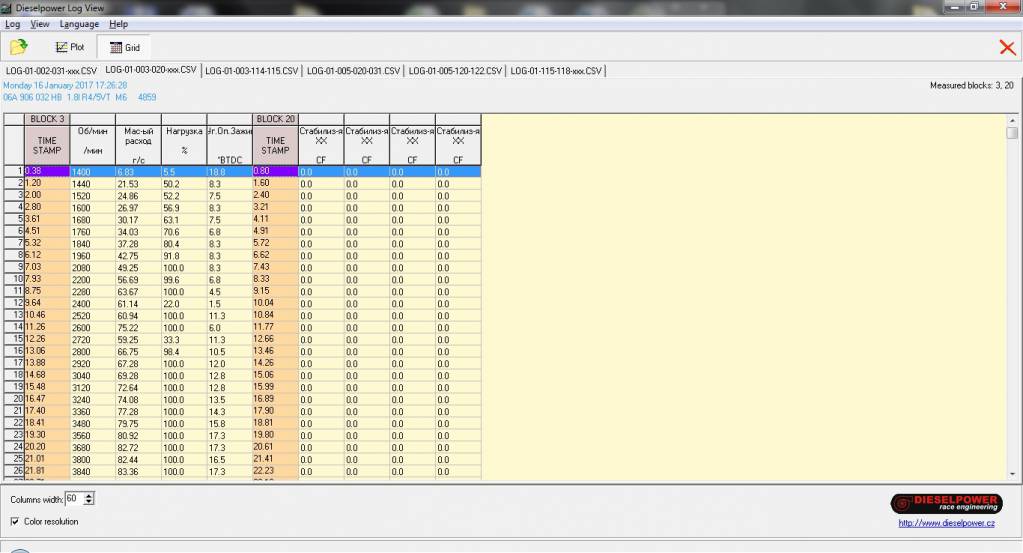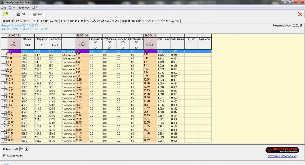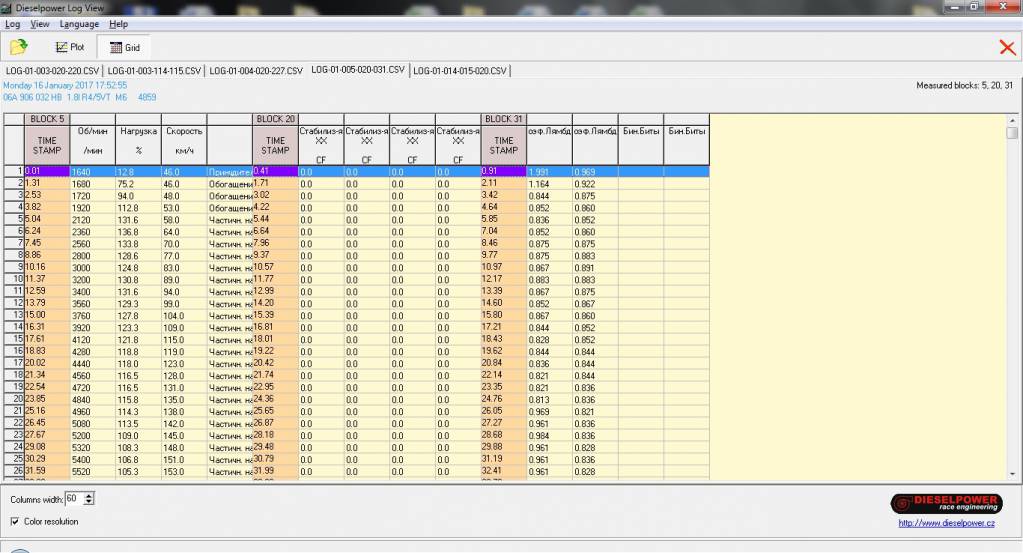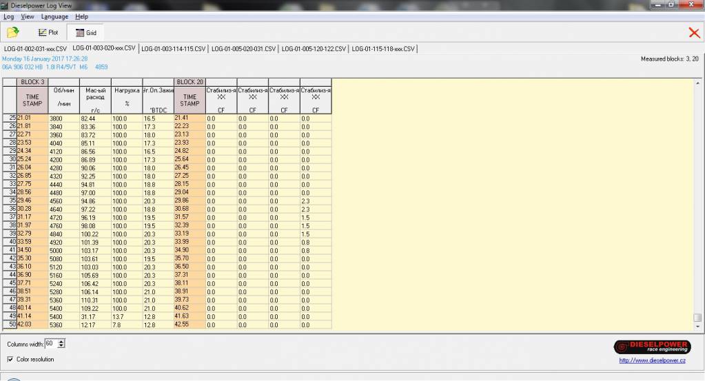Значит так. Турбина у тебя дует так, как это описано в букваре. Значит сама турбина и датчик давления наддува, а так же впускной тракт за турбиной в полной исправности. Показания ДМРВ. Занижает массовый расход воздуха. В пике около 5000 оборотов он должен выдавать 120 грамм. Твой показывает 103. Делим на 0.8, получаем 128 л/с. Расчет грубый, но не лишенный смысла. Причиной может быть подуставший ДМРВ, или дырки во впуске до турбины. В работе клапана n75, я проблемм то же не вижу. Все в норме. Ещё одна видимая проблема - это слишком богатая смесь. Слишком богатую смесь показывает лямбда, но и не многим меньше просит ЭБУ. Думаю, что этот глюк из за газового оборудования. Газ беднит смесь, ЭБУ добавляет. Мозг к этому адаптируется. В последствии при работе на бензине, по газовым настройкам смесь получается переобогащенной. Подтверждение моей теории будет видна в 32 группе. Её показаний я тут не вижу. Итог, что бы я тебе посоветовал, с помощью газовщиков чуть обогатить смесь на газу. Отключить гбо, подключить ваг ком и провести сброс ошибок, даже если их там нет. После этой процедуры в 32-й группе в обоих окошках будет 0. Не включая ГБО, снять логи, групп: 003,114,115 и 003, 020, 031. Два лога. Записать показания в группы 032, после снятия лога. Я думаю, что в процессе ты сам почувствуешь, что машина станет заметно динамичнее. Получившиеся показания, сюда. Ещё раз посмотрим. Обращаются внимание, что при снятии логов мотор должен быть прогрет до рабочей Температуры, тапку жать резко и сразу в пол, не ослабляя нажатия во весь процесс ни на грамм.