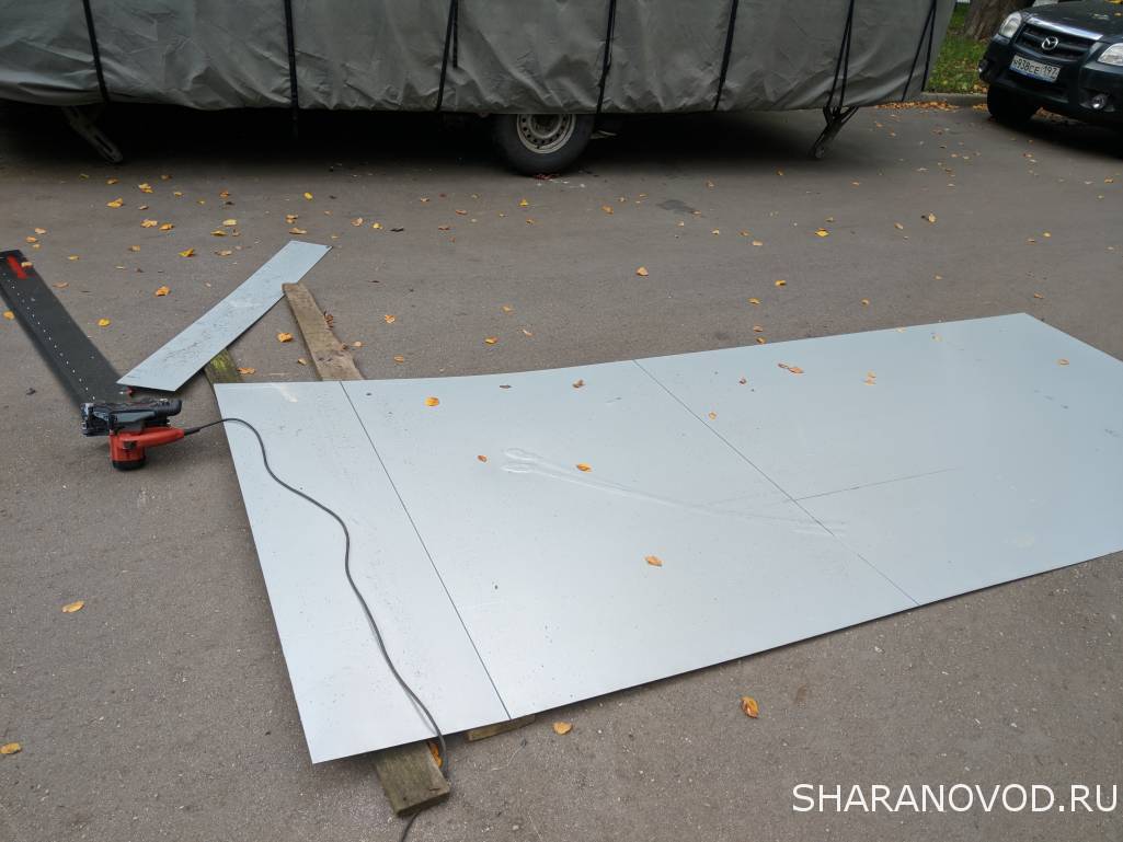 Надрезал по местам гиба под 60 градусов, не дорезая на 1-1,5мм Подогнул, примерил Догнул по месту ещё, содрал пленку, проклепал Лист покупался пофиг какой, главное дешевле. Зильоным под тент положил).