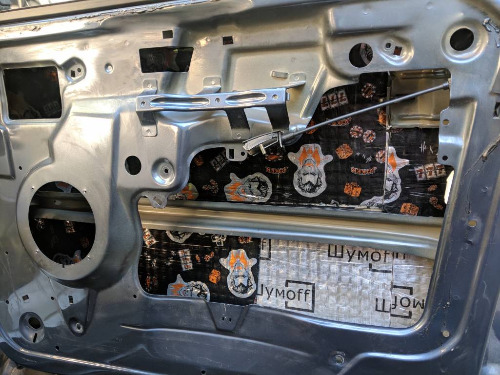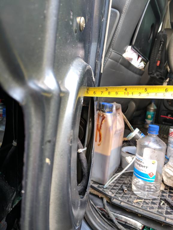 Ну и с задними играюсь. Установочная 50мм, можно отжать ещё мм 5-7, если под нижние болты направляющих стекол подложить дистанционные втулки. Но с наружной стороны двери лезет 5мм втулка, а с внутренней, где динамик, аж 15мм. Далее наружная может задеть усилитель. Не пилить же его. Но прироста не даёт, толстая внутренняя. Направляющая стекла так изогнута, что отжав низ на 15мм, по оси динамика выигрываем 5-7. А этого крайне мало. И карта труба в месте динамика. Всего 10мм до гриля, а ещё и диффузору ходить, и коаксиал в головке торчит обычно.