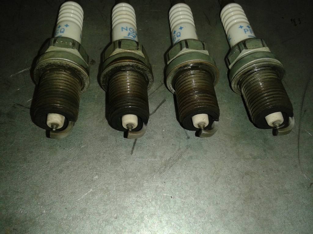 Как то вторая свеча слева не очень, вся резьба в масле. Или сама свеча плохо работает или катушка с перебоями. Я бы обратил внимание на эту катушку, где свеча стояла. У меня похоже было, так при резком ускорении подергивалась - поменял катушку, все прошло. Теперь все свечи сухие.