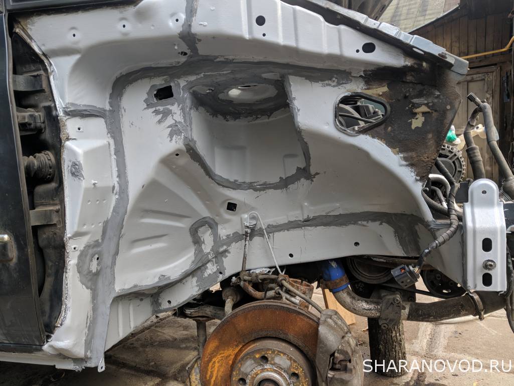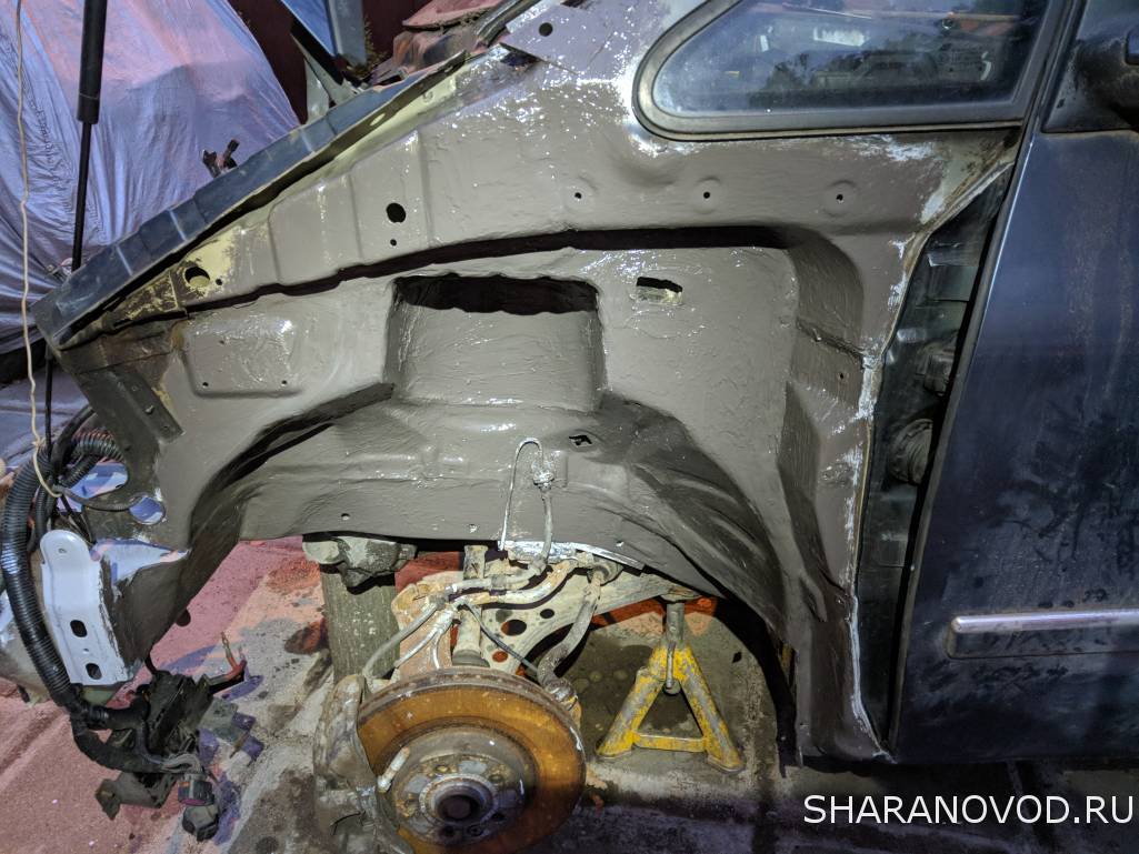 Коррозия собака под подрамник слева закралась, пришлось приотпускать и под ним тоже грунтовать. Подсунул лист фторопласта пока, чтоб не царапать лонжерон