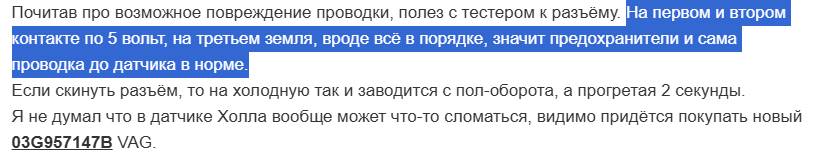 Исходные данные: Sharan 1,9 tdi двигатель AUY 2001г.в. Не заводится (при работающем двигателе пытался 3 раза воткнуть обратно фишку на датчике масла G266, которую выбивало с звуком "пшика", потом обнаружил, что фишка снутри чуть оплавилась). Заглушил. И обратно уже завести не смог. Ни на горячую, ни на холодную.