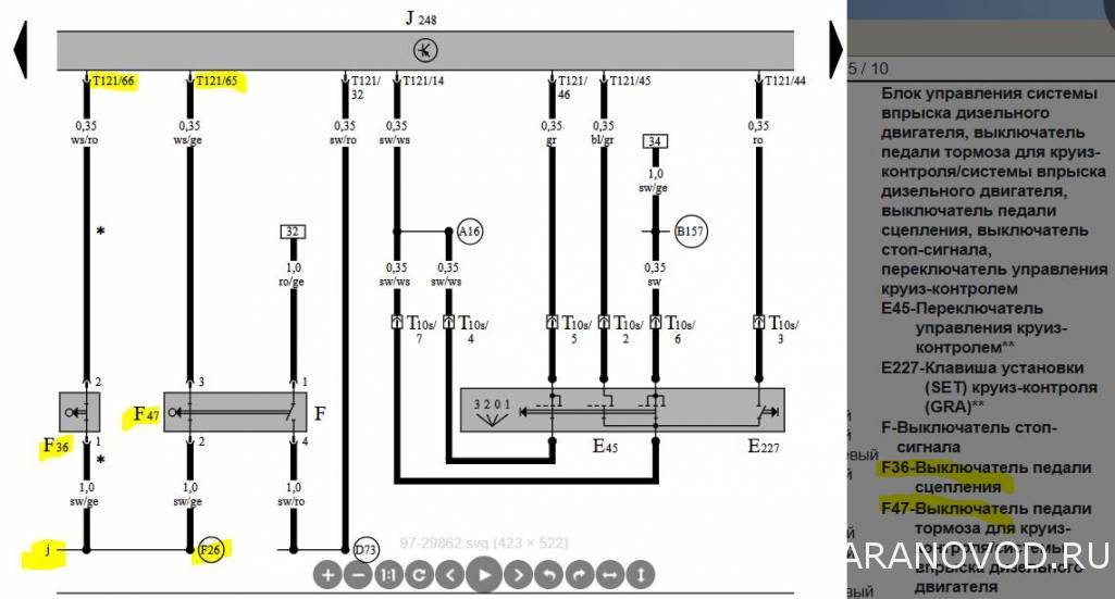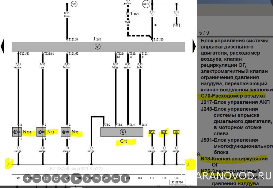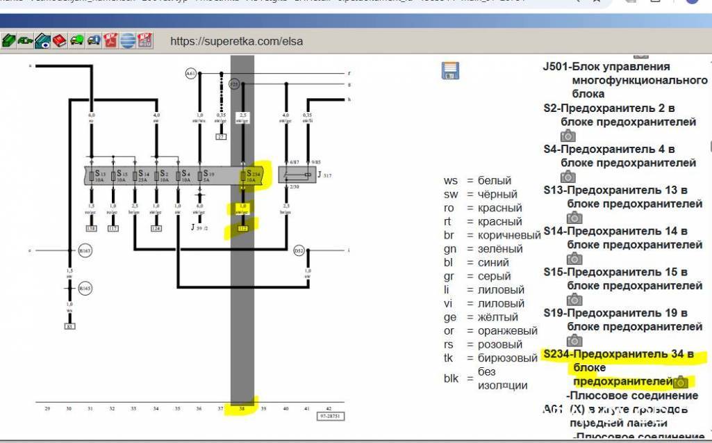 Или кроме также F36 и F47 (я так понимаю это какие-то реле) больше никуда не идет этот провод? ... позже обнаружил, что к j подключаются также клапана управления N18 и N75 - что реально наводит на мысль, что "j" - похоже какой-то питающий общий провод. Вроде нашел что "j" выходит на предохранитель S234. Есть где-то полная схема на одном огромном рисунке? И есть где-то инфа на каких пинах сколько вольт должно быть? и по датчикам инфа - как они должны звониться если исправны?