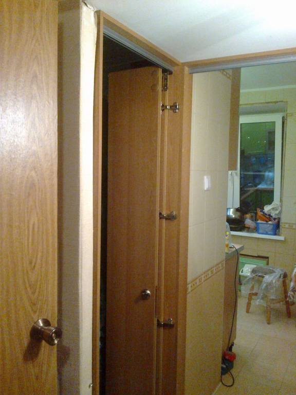 Ни как не могу найти фотки, товарищу делал двери. У него прихожая метр на метр и там две двери, ванна и кухня.