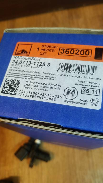 Загорелись пресловутые лампочки ABS и ESP. Считывание кодов показало Датчик частоты вращения переднего левого колеса G47 . Оригинал стоит космос. Номер 7M3 927 807 H. Конечно же он с приблудой индикатора износа колодок :facepalm: .Решение нашлось в покупке датчика фирмы ATE под номером 24.0713-1128.3. Цена настораживала-1700 руб. Думал может левак какой или бэушка.Оказался полнейший аналог с запиленными оригинальными номерами.Так что, берите на заметку ,кто не в курсе. Короче счастья полные штаны. Уже поменял. Все лампочки погасли сами. Надо ещё память ошибок стереть. Замена заняла 2 часа в экстримальных условиях дождя,ветра ,снега . Выковыривание старого датчика самое тяжёлое. Высвеливал, выкорчёвывал и прочее . Самое главное не повредить ответную гребёнку на валу. И на закуску аккуратно почистить посадочное место наждачкой. Новый датчик входил с небольшим усилием. После чистки колодца и ВЭДЭшки всё встало на место без проблем.