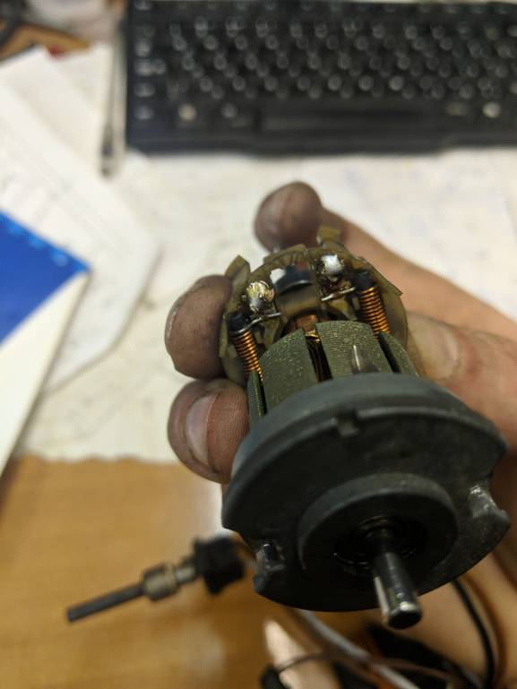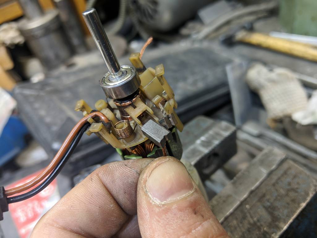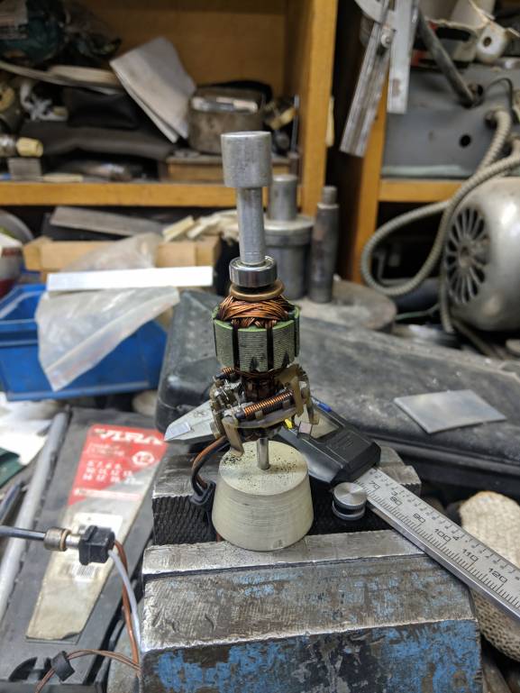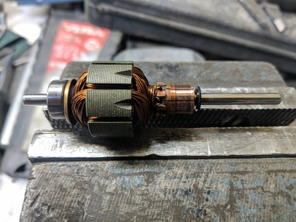 Ломать не строить. Давим подшипник тисками за неимением съёмника. Остаётся внутренний сепаратор, за него и хватается Второй аналогично. Предварительно замеры посадок подшипников Выточил насадку для запрессовки и основание из подручной втулки, чтоб не падал ротор, а то рук то мало Заодно зачистил коллектор Щетки припаял с обратной стороны, просунув пол пластинкой, чтобы при лужении не закозлился поводок Отправлено спустя 1 минуту 54 секунды: