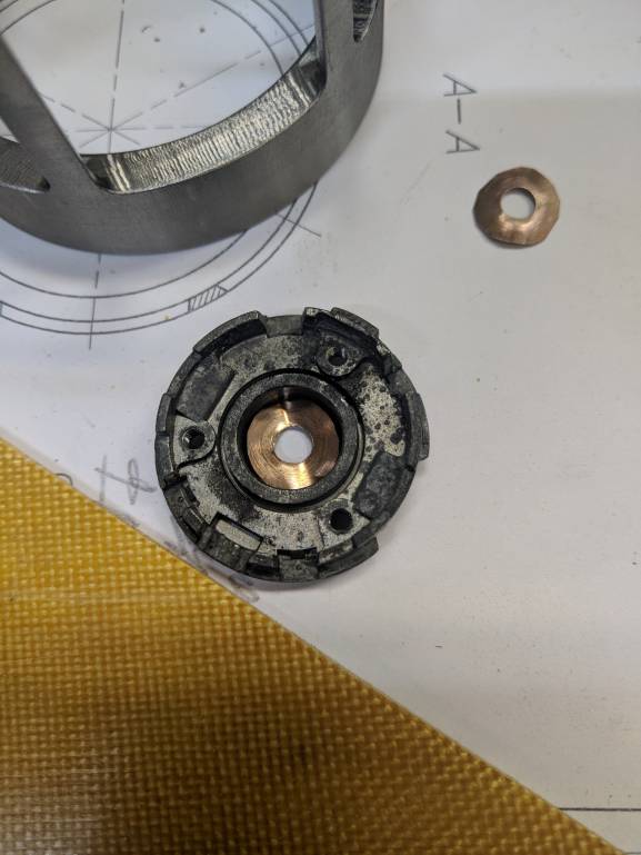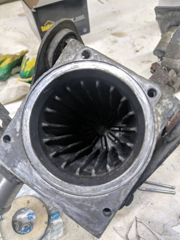 Подогнанная была без шайбочки дистанционной. Но не проблема, лист бронзы 0,2 подкаленой и вроде вышло. Не с первого раза конечно В заднюю крышку вставляем подшипник, стопором его штатной шайбой Ну а дальше дело техники И выходит до соток как было Засаживаем крыльчатку. У меня зазор был 0,2мм. Так и повторил Заодно очистил камеру от копоти Асбестовое ноу-хау вполне ничего поживает по прошествии 2 лет. Думаю мозгу легче Пришлось также сварганить и приварить кронштейн глушителя из нержи. Черный через пару лет в хлам, 2 раза переваривал уже.