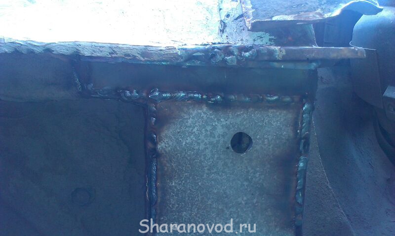 Ну и усилил укосины, что от лонжеронов к порогам идут. Они тоже подмяты были, и в правом несанкционированная дырень. Внахлест приварил 3,3 мм лист оцинковки, из куска рамы пола полуприцепа Schmitz, (из таких же деталей у меня прицеп изготовлен был для моего трак мотоблока.)