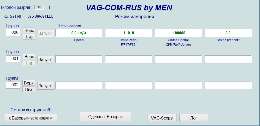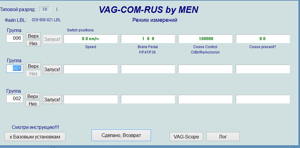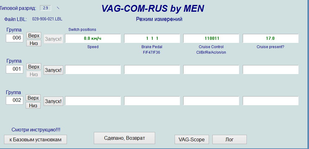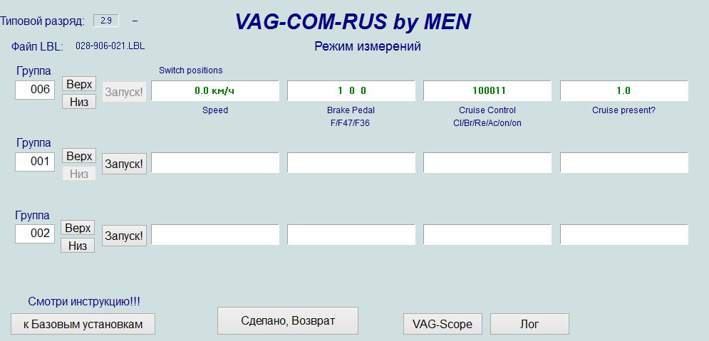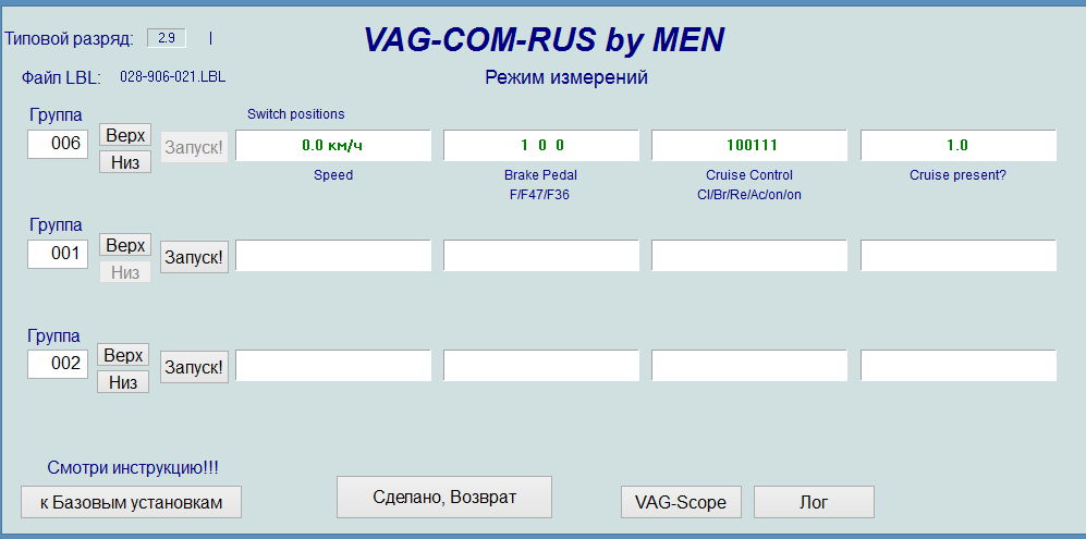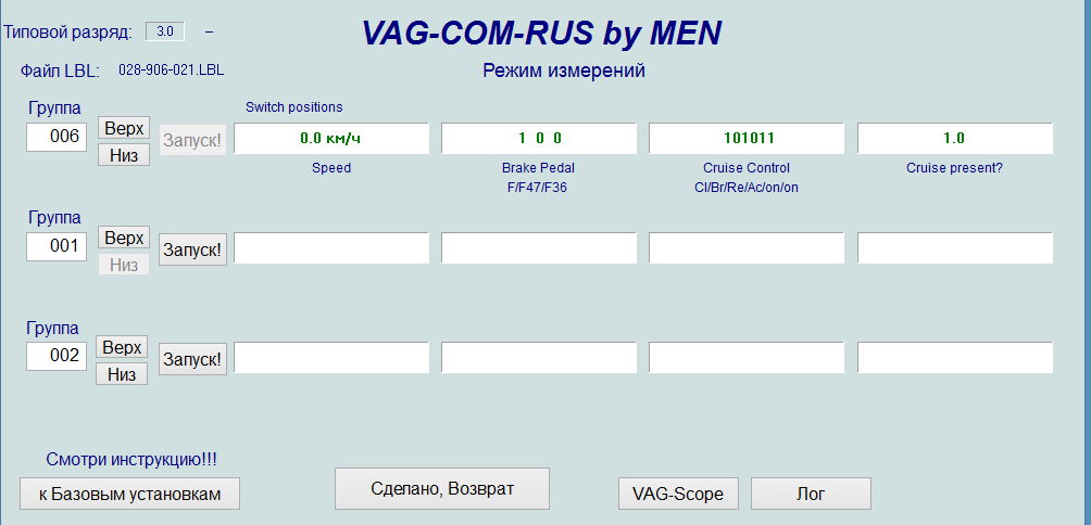 Нашел эту тему по активации круиза, актуальна для меня. Все сделал по инструкции. Только вместо стрекозы управление на кнопках стеклоподъемника. Это не суть, смысл тот же. Так вот, касаемо инструкции у меня в ваге и васе нет группы 66, все в группе 06. Только там экран немного другой. При диагностике вкл/выкл биты меняются, Set - меняются, Res - меняются. На тормоз реагирует тоже, а вот сцепление молчит. Решил проверить в движении - круиз не включается. Может из за того, что сцепление не отвечает?
