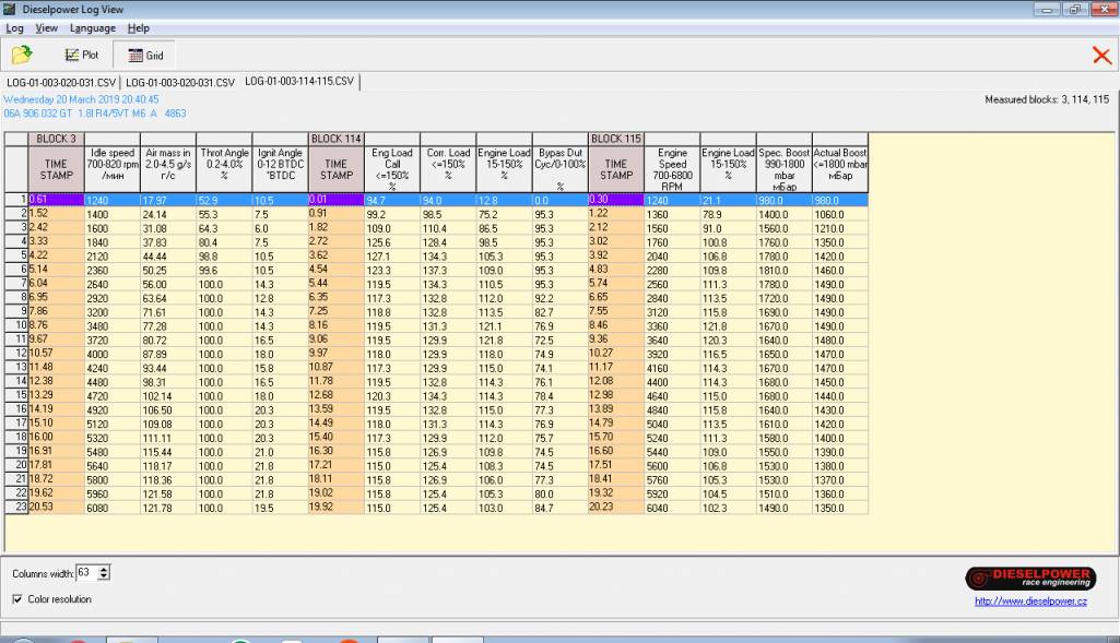 Похоже по воздуху есть проблема. Я бы сказал, что ДМРВ занижает чуть чуть показания. Лямбда реагирует адекватно, ЭБУ под нагрузкой добавляет топлива. Как бы все адекватно. Турбина дествительно разгоняется тяжело. 75-й клапан барабанит на полную, а турбина не догоняет. Ретарды во втором и четвёртом цилиндрах. Вероятно это то же вследствии траблов с воздухом.