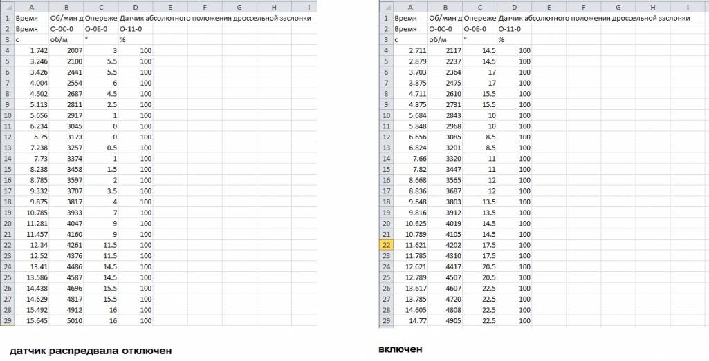 Да думаю, пот крайне мере температура двигателя соответствует показаниям, мерил пирометром, и паралельно программой, сравнивал когда вентилятор срабатывает, итд. Скажите, а может быть такое нарушение из за завышенного показания температуры входящего воздуха? ...п.с. Хотя я ездил смотрел, похоже на правду, там до 30-40 градусов в пробках воздух...на ходу не знаю...]Сегодня снял лог на телефон при отключенном датчике положения распредвала, лог могу показать только мне его не удалось переделать под программу которая открывает логи, сделал Excel....в общем если отключить этот датчик, то показалось что машина тише работает, на хх, проехал не много, гдето 1 км, разгон вялый, отсечка сработала на 5000 примерно.Vitalijster: 25 май 2019, 20:59 А температуру впускного воздуха и охлаждающей жидкости правильно показывает (на холодную и с прогревом)?