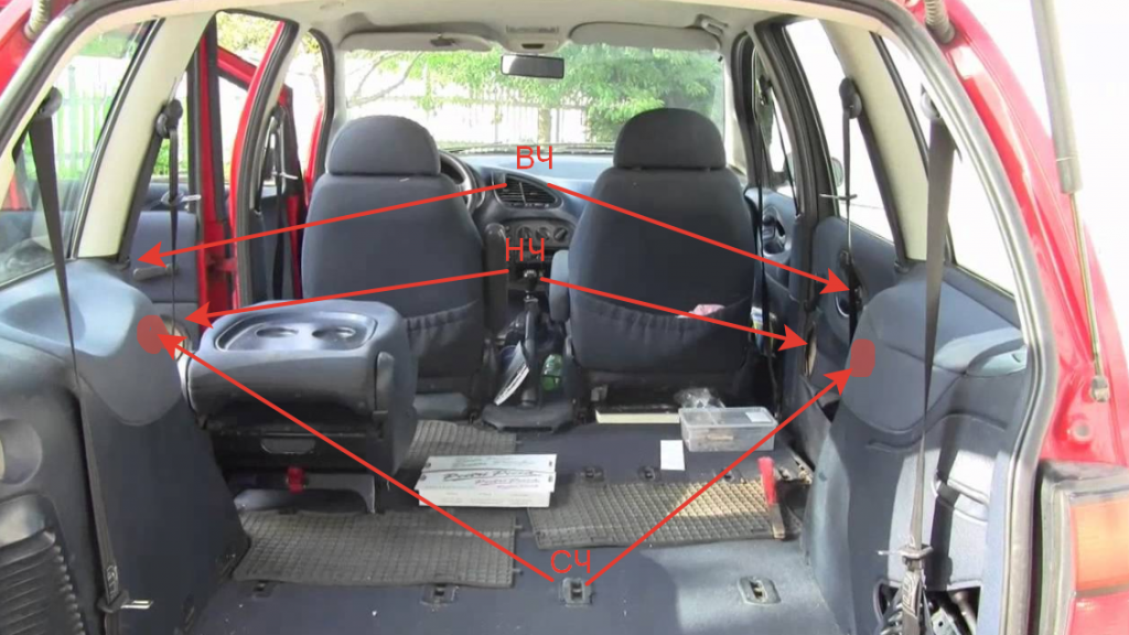 Вот такой вариант спереди Сзади аналогично ВЧ-НЧ в двери, СЧ в 3 ряду в штатные боковины
