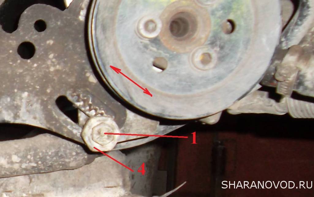 4 - зубчатая гайка, вращая которую передвигаешь насос к/от КВ... Подвинул насос к КВ --> одел ремень