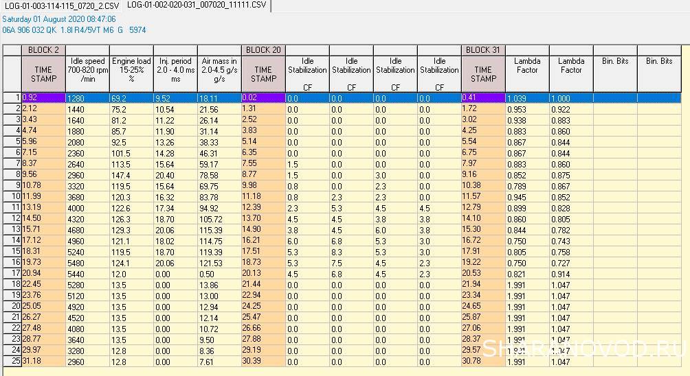 Не опечатка ли в описании групп третьей записи лога? 114 группа не доступна тут.11piligrim11: 09 сен 2016, 23:34 2) для моторов 1.8Т с буквенным кодом AJH - (не имеющих датчик наддува) 002/013/009, 002/024/025 и 002/020/114 (три лога). после записи лога посмотреть на холостом ходу значения в первых двух полях 008-ой группы переписать, указать их в сообщении при выкладывании лога на форуме