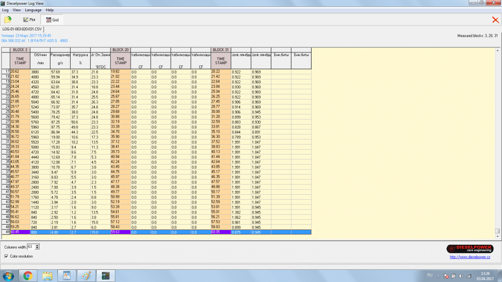 Романыч, подозреваю, что лог снят не верно. Педалька в пол не жалась. Если это так, то нужно переснять. Если же нет, то похоже проблем в этом моторе просто не счесть. Особенно напрягает 32 группа. Наличие мультипликатива, аж в плюс 7 - бешенно бедная смесь, и бешенно врёт ДМРВ.