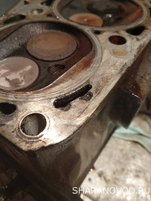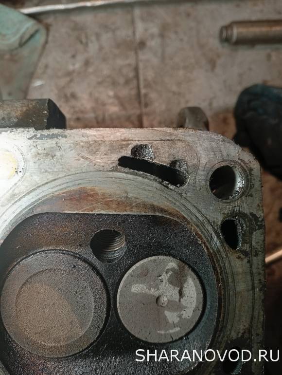 Я сегодня отвез свою ГБЦ на шлифовку и опрессовку. С мастером посмотрели, покумекали - вроде должна норм отшлифоваться, посадочное место прокладки у цилиндра раковина не затрагивает. Ну посмотрим. Кстати, раковины появились не просто так - вот этот канал в рубашке охлаждения в ГБЦ продолговатый а на прокладке ГБЦ вместо соответствующего продолговатого отверстия были два круглых, и раковины точно соответствуют этим двум круглым отверстиям. Почему так - ХЗ.