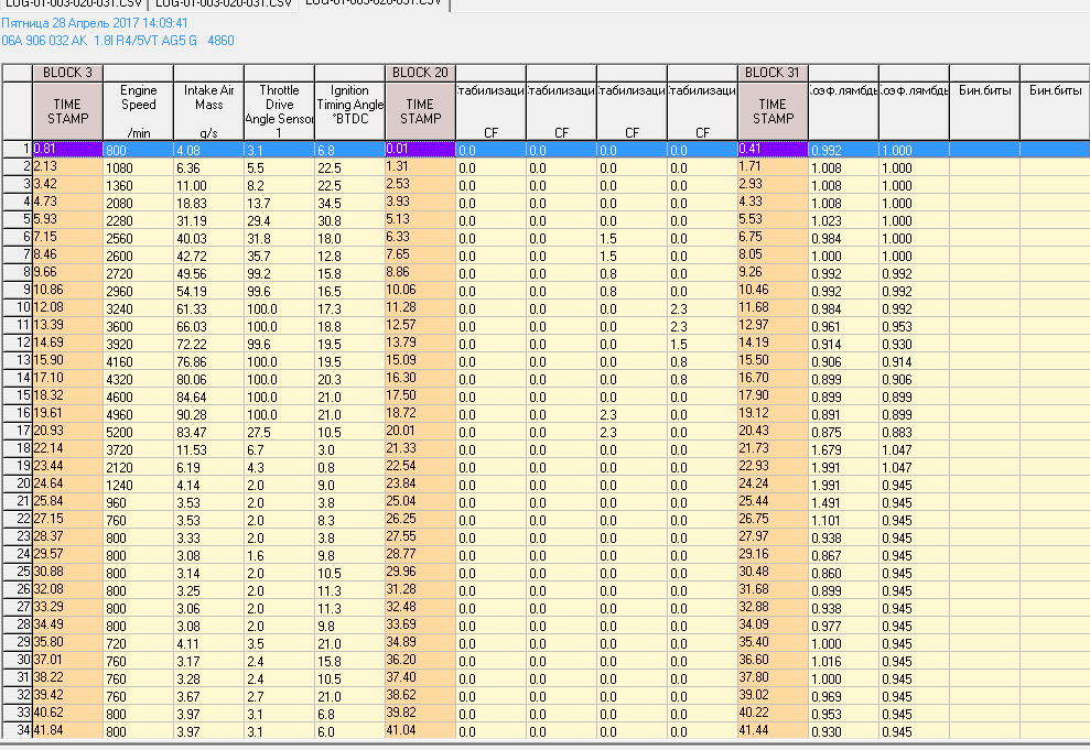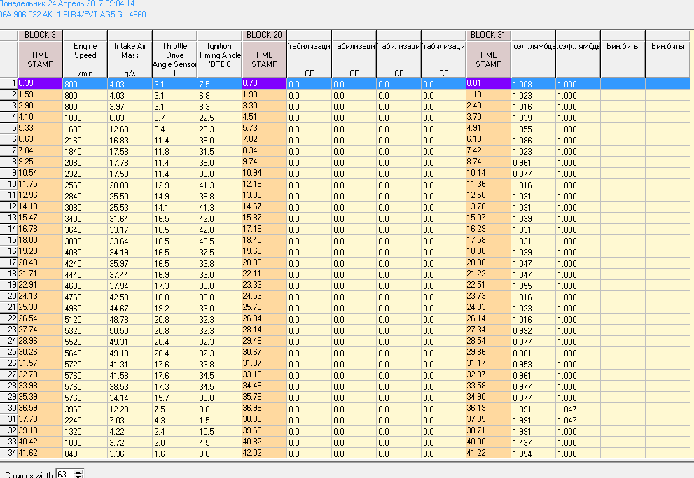 Вот произвел замену дмрв на Bosch 0 280 218 060. Ошибка по переобеднение смеси пропала, но по лямде так же весит. Фишку осматривал, ни чего криминального не увидел. Может быть лямда не подходит по характеристикам к моему движку, т.к брал лз производства mobiletron ( менял его год назад). Расход бензина тоже завышенный. 20 литров залил, проехал на них около 110 км. в городском цикле. Вот снимал логи сегодня, посмотрите. Да, и в 032 уже показывает по нулям.