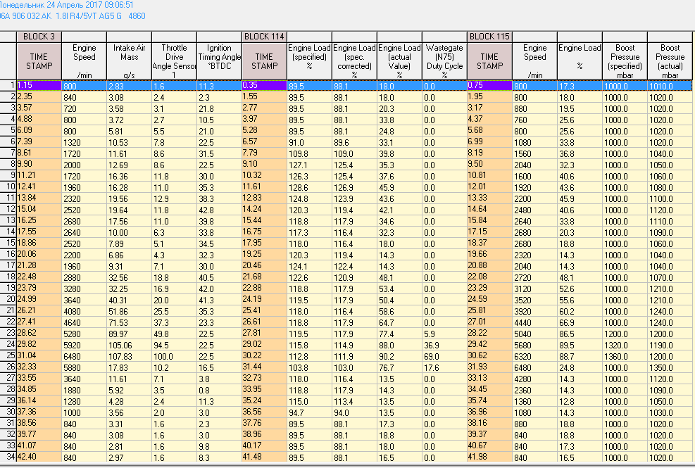 Пока не вижу ничего утешительного. Во первых, мало воздуха проходит через ДМР возможно врет, а возможно и нет, потому, ка турбина недодувает до расчетных значений больше 200 единиц. (должно быть около 100). Судя по показателям ДПДЗ, тапка была дожата не до конца, хотя, возможно, ЭБУ сам откатил показания ДПДЗ из-за недостатка наддува, например, или из-за имеющихся ретардов в третьем и четвертом цилиндрах.