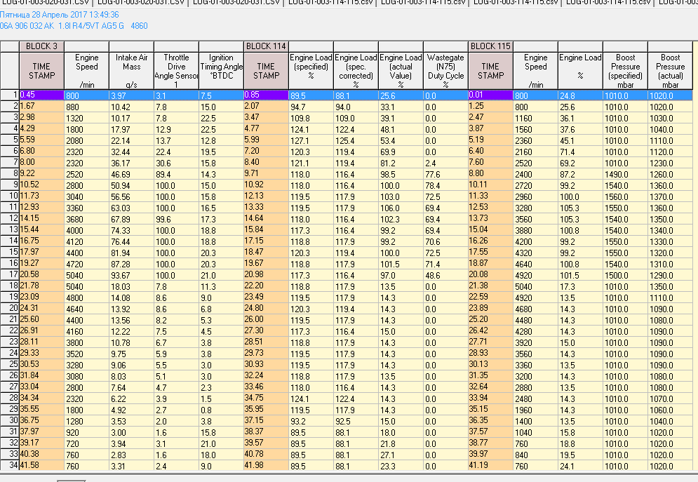У меня по логам после многих ремонтных работ и чипа получается такая ситуевина. Турбина с новым картриджем, голова как новенькая, компрессия поднята, клапана и седла притерты, чиповалась машина под газ(теперь только 98-й заливаю). Так вот не пойму почему после всего этого по показаниям ДМРВ у меня пик 130 грамм, хотя до этого у меня при мертвой турбе, мертвом байпасе и мертвой компрессии пик был 118. Разница не большая как по мне для всех работ, которые проделал и сил вложеных. Так и про момент тоже практически ничего не поменялось, хотя после чиповки в тюнинг конторе такие двигатели получали около 190 лошадей и 300 момента. Углы поменяли и наддув стал в пике 1.1-1.2, а так дует 0.8. В чем может быть загвоздка?