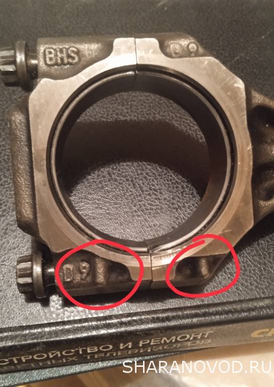 если их нет, тогда как вариант, снять вкладыши и совместив бугель с шатуном, искать совпадение по рискам обработки...