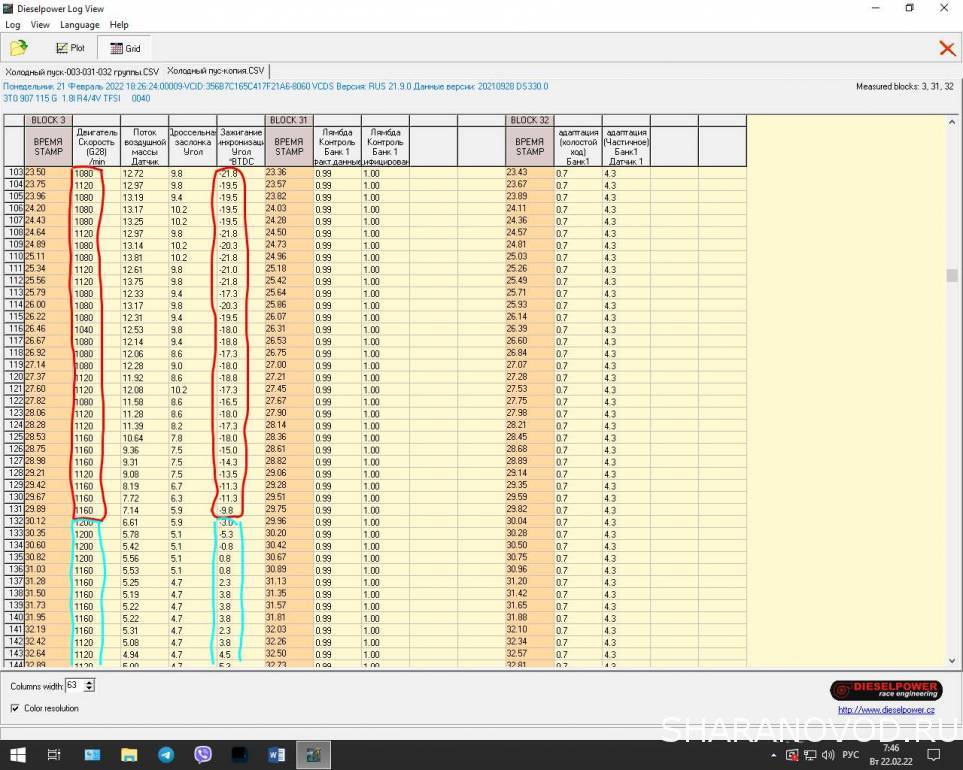 Добрый день. Записал два лога. 1. Пуск холодного двигателя после ночного отстоя на стоянке. 2. В спокойном движении по дороге. Двигатель 1.8 TSI