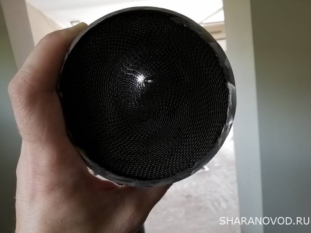 Получилось так. А так светились фаетоновские катализаторы.. на моем только пару дырочек по середине было видно и немного больше по краям.. долго я свой пытался отмыть в разной химии (раза 3 снимал), стало конечно лучше, но полностью он не отшептался.