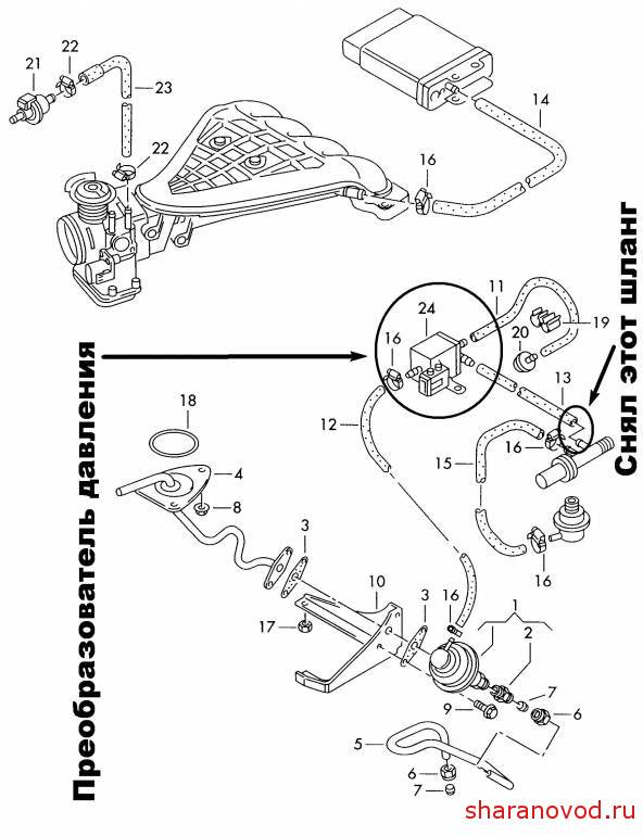 1. Когда на заведенном снял шланжичек тонкий(диаметр 5 мм наверно) идущий от вакуума к Преобразователю давлениЯ(054906267A рядом с расширительным бачком, ниже фото) обороты повысились(приблизительно на 80 об), чувствовалось поступление воздуха, штуцер шланги палец засасывал(если приложить).