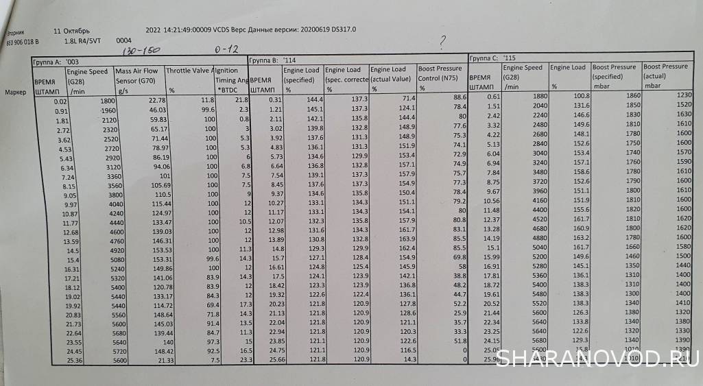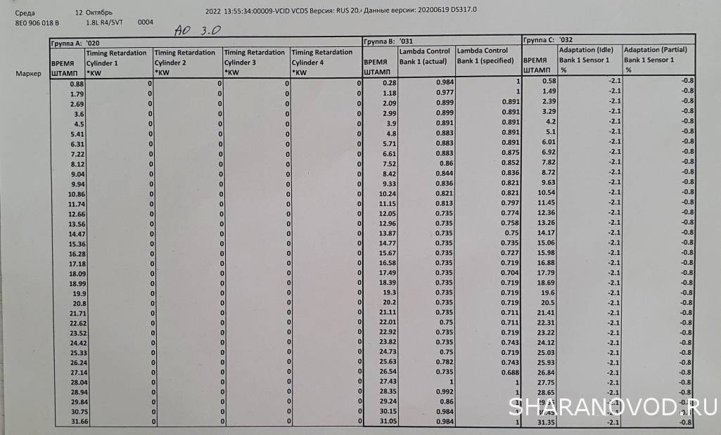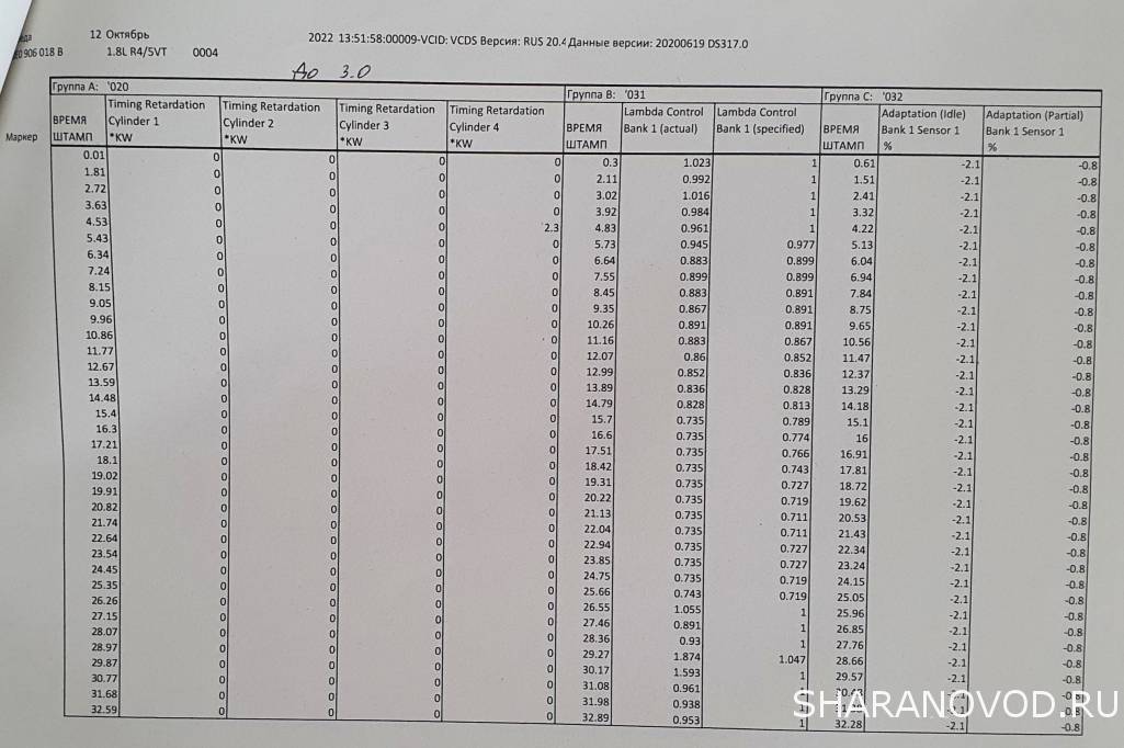 Добрый вечер, сегодня собрался было снять э/м клапаны фазорегулятора но прежде решил глянуть в группы 208,209,93 и заметил странные(для себя) несуразности, все у меня не так как надо, в 208 стабилизацию хх вообще непоказывает, в 209 - 0.0CF(а не KW как сдесь https://www.drive2.ru/l/9297171/) , а в 093группе так воопше -50.5CF. подскажите кто знает о чем говорят эти цифры, = почистить фазорегулятора или у нас неправильно стоят метки