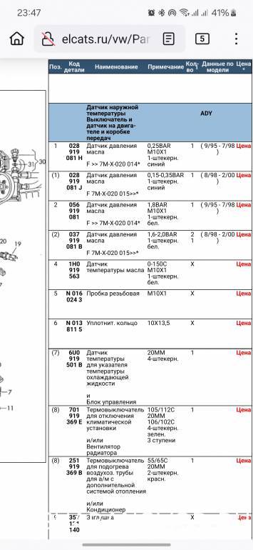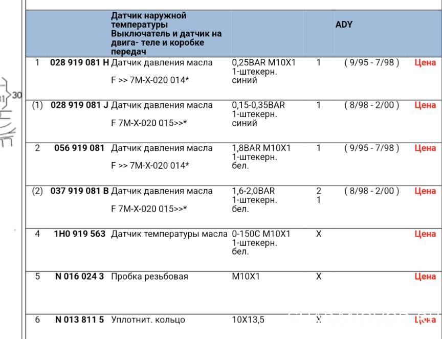 Принцип работы системы предупреждения аварийного давления масла одинаков для большинства моделей автомобилей, выпускавшихся концерном V.A.G в период с начала 80-х годов. Система обрабатывает сигналы с двух датчиков давления и сигнал о текущем значении оборотов двигателя. Датчики давления представляют из себя выключатели, срабатывающие при определенном давлении масла в системе. Датчик нижнего порога - нормально замкнутый. Размыкается при достижении давления в 0.3 бар. Датчик верхнего порога наоборот - нормально разомкнутый и замыкается при давлении масла выше 1.8 бар (*). Допустимый технологический разброс порога срабатывания датчиков составляет 0.3 +/- 0.15 бар и 1.8 +/- 0.2 бар. Конкретная реализация электрической схемы и ее конструктивное исполнение, а также точка съема сигнала оборотов двигателя несколько отличается у разных моделей, а также у моделей оборудованных системой ?Auto-Check¦ (Audi) (*) Значение верхнего порога может отличаться на некоторых моделях двигателей. Например, есть двигатели на которых установлен датчик на 1.4 бар (черного цвета).