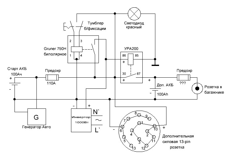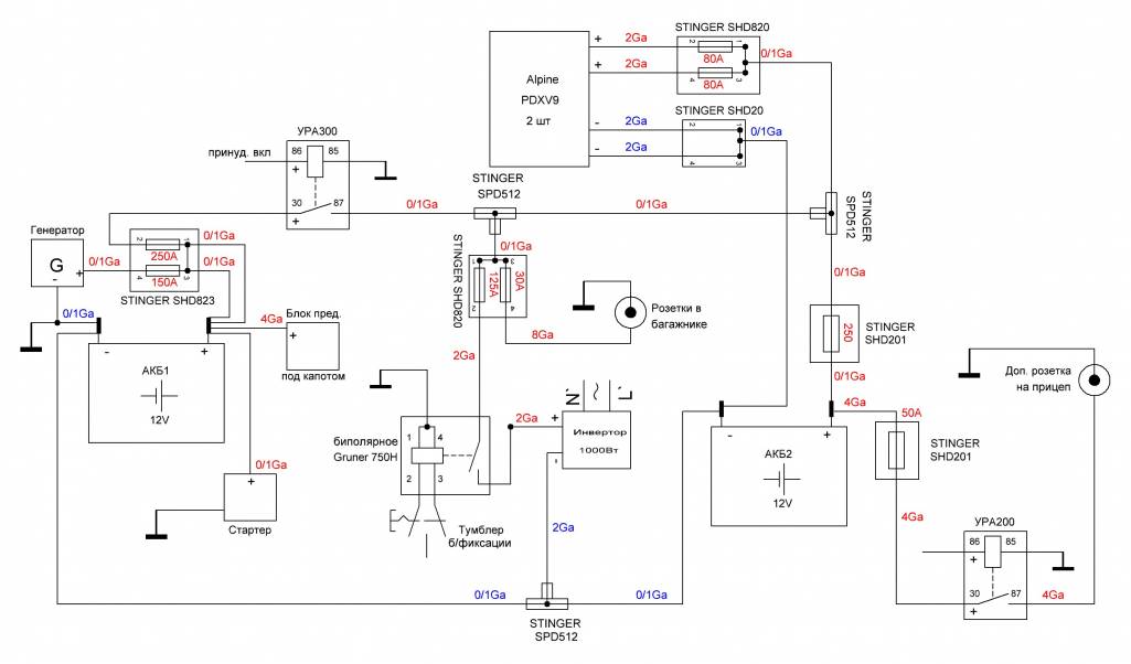 Инвертор не будет работать одновременно с музыкой. Во всяком случае не планировал-этож смерть АКБ.Aka777: 31 авг 2019, 16:24 схемы видел, увеличь сечения немного на инвертер 220в 1квт желательно прямо с АКБ, Где Кондер на 2фарада? я подключал АКБ 2 шт в параллель естественнопо 100ампер при этом пусковой ток вырос не мерил на сколько но провод на стартер пришлось переделать чтоб как сопротивление работал иначе спалишь нафиг.