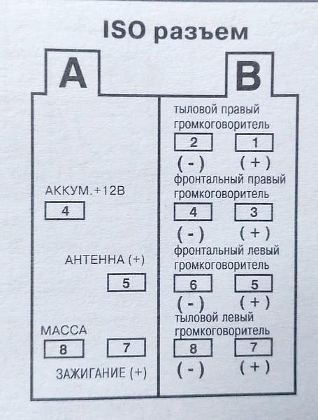 Я почему то думал, что ISO фишки для подключения магнитолы это стандарт для всех типов магнитол. Однако сейчас столкнулся с проблемой расхождения в подключении. Решил поменять магнитолу на другую и для начала хотел сравнить все ли там соответствует. Вот к примеру схема подключения из букваря магнитолы.