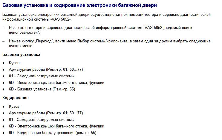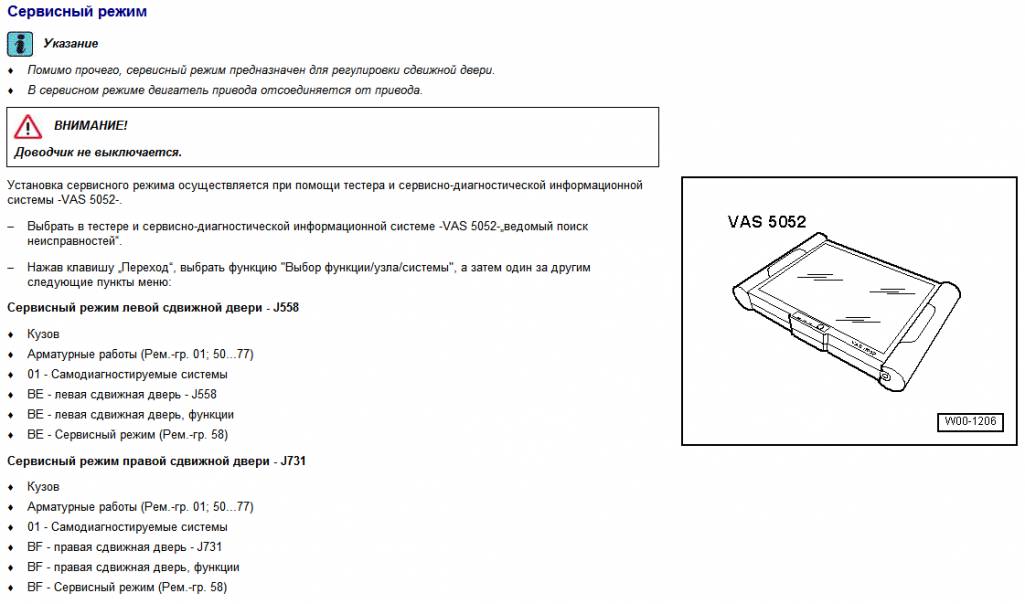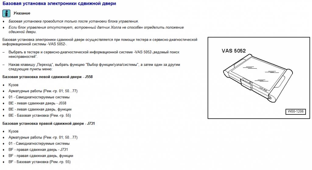 У сдвижных дверей есть Базовая установка и Сервисный режим (предназначен для регулировки сдвижной двери)... У двери багажника упоминается Базовая установка и Кодирование...