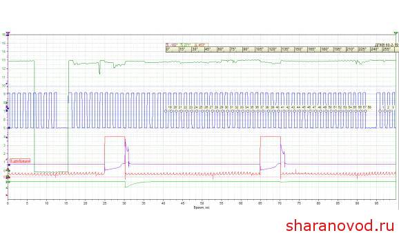 Тут виден импульс на катушку первого цилиндра. И можно подсчитать опережение зажигания.. С учетом что 1 зуб коленвала это 6 градусов, по осциллограмме видно, что опережение около 1,5 зуба, то есть 6х1,5=9 градусов (примерно). Тут же посмотрел в ВагКоме, немного прыгает, но среднее опережение на Х.Х. около 9