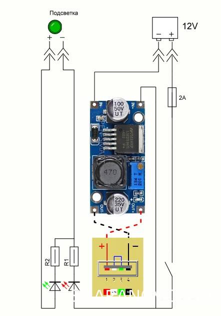 Т.к. плюс брал от прикуривателя, а он у меня подключен постоянно, то пришлось добавить кнопку для отключения схемы. При необходимости ее включать. Зеленый СД включается при включении общей подсветки приборки, а красный только в момент активации работы платы ЗУ.