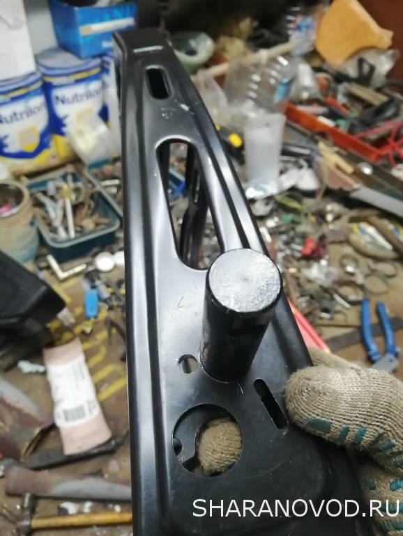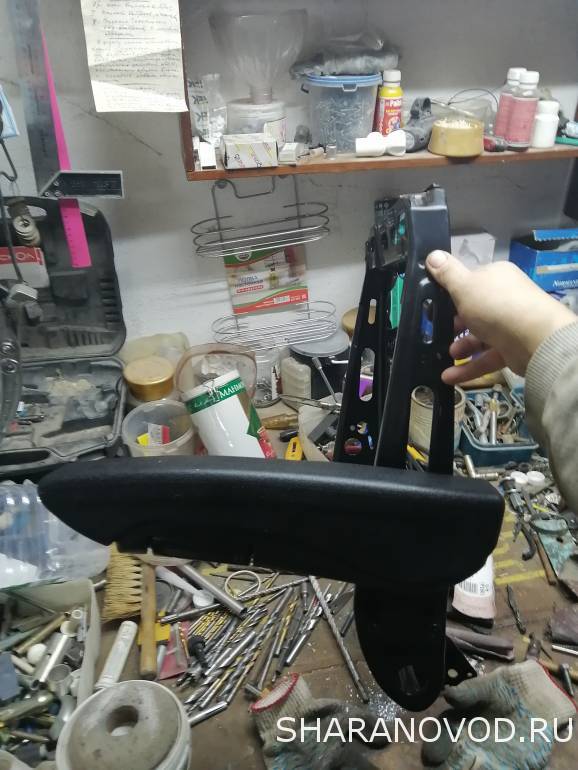 От крепления подлокотника отрезаем всё лишнее и сверим отверстие 8 мм для фиксации в каркасе. Можно было бы прилепить его снаружи, но что-то мне не зашло.