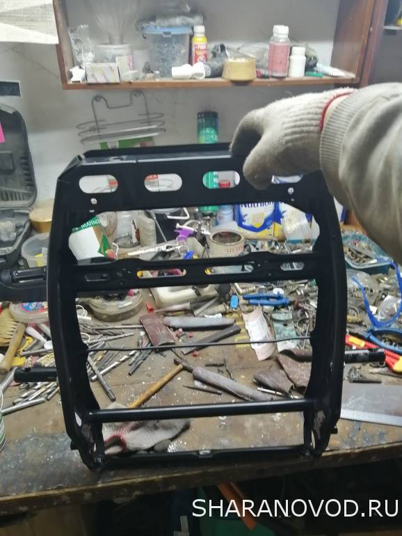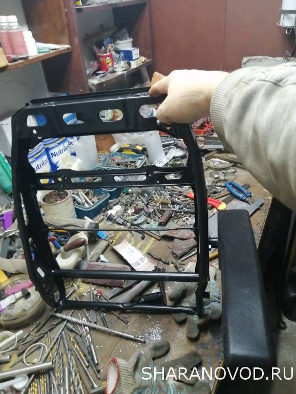 Немного пришлось переместить крепление подлокотника на каркасе сиденья. Если вы не обладатель баскетбольного роста, то лучше крепить кронштейн в районе второго отверстия (обвел красным), тогда расположение рук получается более удобным. И да, ненужно мудрить с установкой крепления внутрь каркаса, гораздо проще и удобнее расположить его снаружи, ось крепления подлокотника должна находиться прямо над нижним отверстием каркаса.