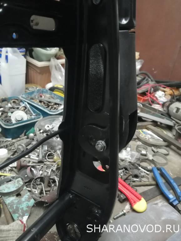 Фиксируем крепление болтом с гайкой на фиксатор резьбы. Думал ещё прихватить сваркой к каркасу изнутри, но пришёл к выводу, что жёсткости конструкции это не добавит.