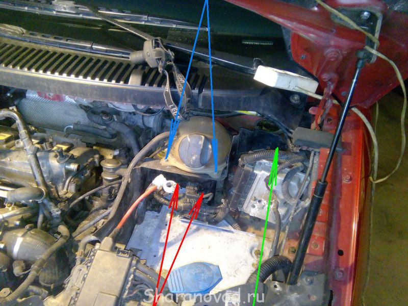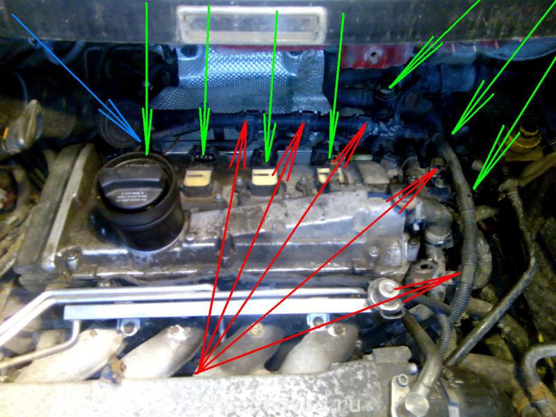 Далее снимаем жгут проводов к катушкам зажигания. Для этого, отсоединяем разъемы катушек, разъемы двух датчиков температуры, разъем электронного клапана ЕГР. (помечено зелёными стрелками). После этого откручиваем кронштейн крепления пластиковой крышки двигателя (указано синей стрелкой) освобождаем из-под него массовый провод. Отщелкиваем крепление кабеля. Места крепления помечено красными стрелками.