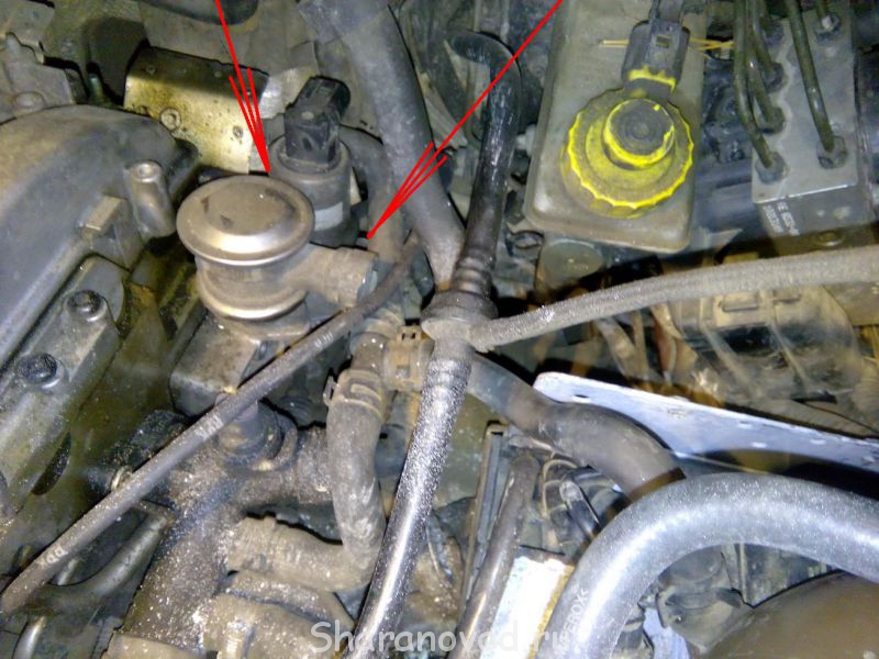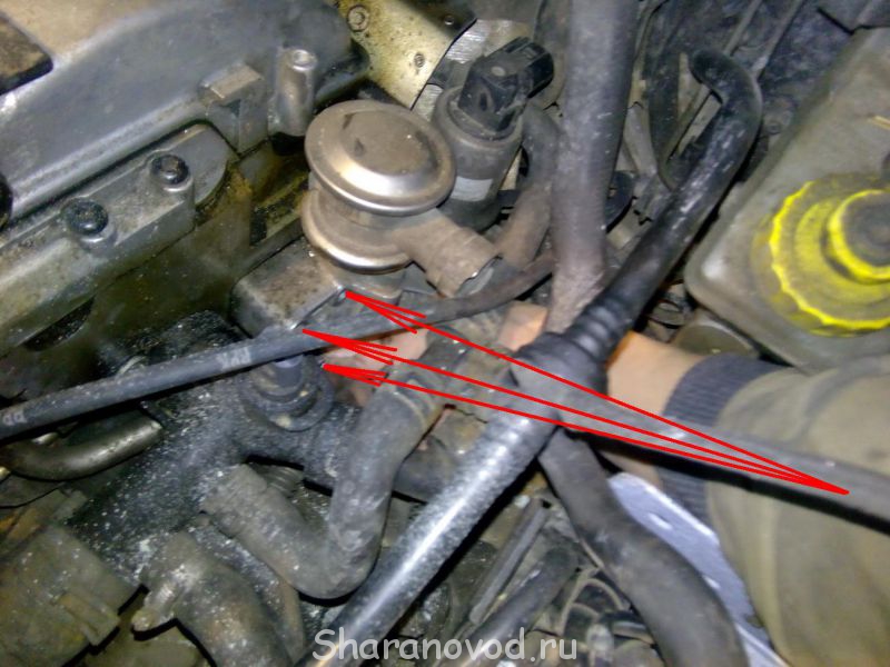 Убираем трубку вентиляции картера в сторону и отсоединяем вакуумную трубочку от электронного клапана ЕГР