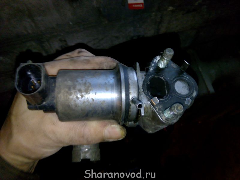 Извернувшись, чуть не на пупе, нужно открутить две гайки на 13, крепления трубки ЕГР, с тыльной стороны клапана. Откручиваем и ни чего снимать не пытаемся. Бесполезно. Одна гайка откручивается обычным накидным ключом (а другим не подлезть) а вторая, головкой через карданчик маленькой трещёткой.
