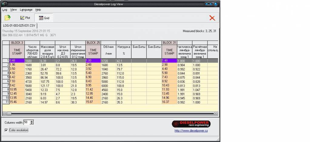 Итак, скачиваем программку распаковываем, запускаем, в появившемся окошке ставим галочку, тыцкаем ОК. программка открывается. далее Log\Open\ Находим в появившемся окошке где у нас спрятался установленный VAG-COM, и папка в нем Logs, в ней находим снятые нами логи. Открываем. Сверху видим 2 режима отображения – Plot и Grid Первое является графическим отображением данных лога, что удобно и показательно для сравнения некоторых данных, но остановимся мы на табличном отображении Grid. Что мы видим ?